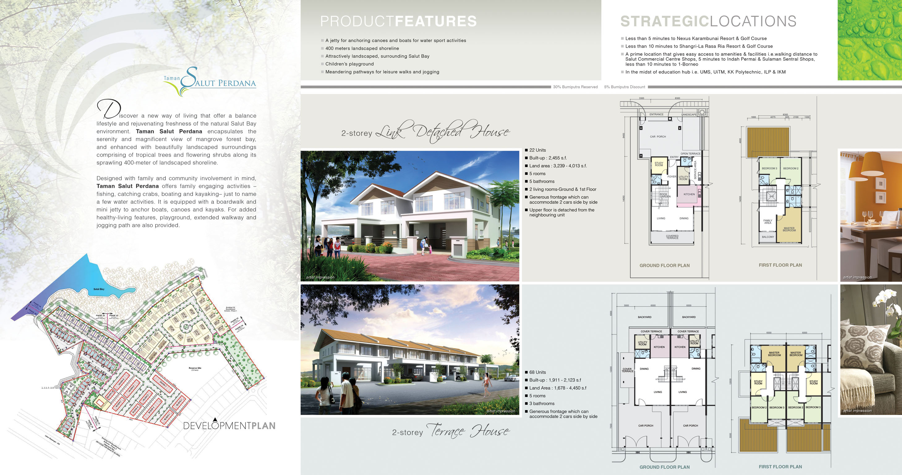Discover a new way of living that offer a balance lifestyle and rejuvenating freshness of the natural Salut Bay environment. Taman Salut Perdana encapsulates the serenity and magnificent view of mangrove forest bay, and enhanced with beautifully landscapped surroundings comprising of tropical trees and flowering shrubs along its sprawling 400-meter of landscapped shoreline.